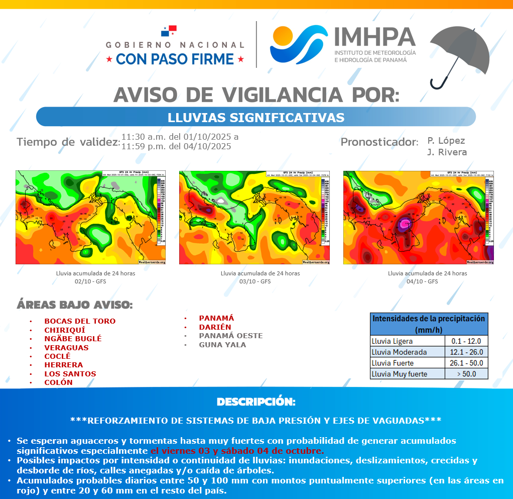 Por mandato de lo establecido en la Ley No. 209 del 22 de abril de 2021, se pone a disposición de los interesados la información contenida en este sitio, para su utilización por cualquier medio legal, pero su uso deberá citar la fuente: INSTITUTO DE METEOROLOGÍA E HIDROLOGÍA DE PANAMÁ, (IMHPA). El instituto, no se hace responsable de ningún error, omisión, interpretación, pérdidas o daños que resulten de la utilización de la información o material contenidos en este sitio, por parte de usuarios, visitantes o terceras personas y su uso indebido y sin confirmar, estará sujeto a sanciones penales (Artículos 289, 290 y 291 del Código Penal) y/o administrativas. Además, en algunos casos que les sea aplicable, dicha información puede ser actualizada por el IMHPA, para corregir errores o imprecisiones
