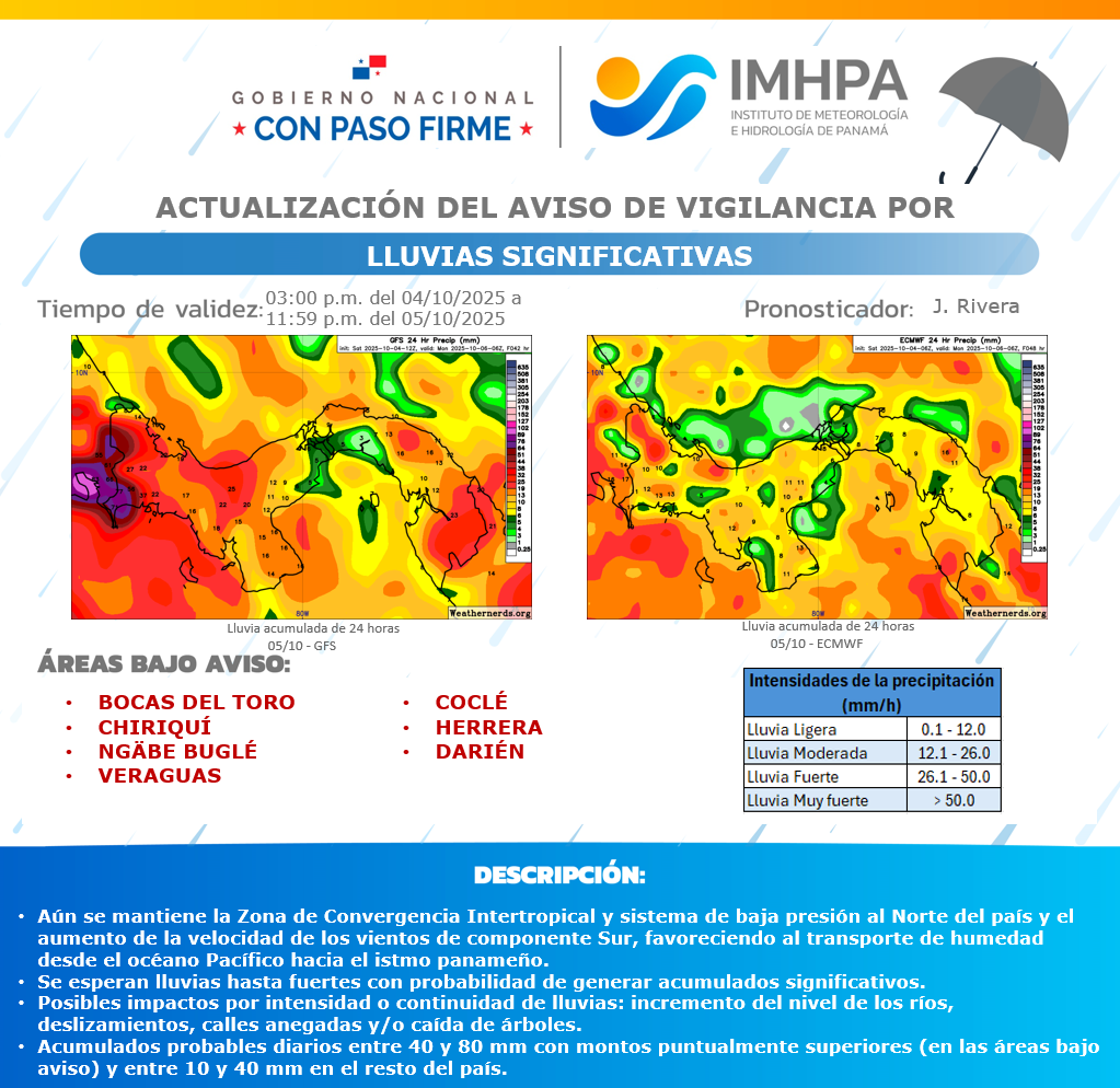 Por mandato de lo establecido en la Ley No. 209 del 22 de abril de 2021, se pone a disposición de los interesados la información contenida en este sitio, para su utilización por cualquier medio legal, pero su uso deberá citar la fuente: INSTITUTO DE METEOROLOGÍA E HIDROLOGÍA DE PANAMÁ, (IMHPA). El instituto, no se hace responsable de ningún error, omisión, interpretación, pérdidas o daños que resulten de la utilización de la información o material contenidos en este sitio, por parte de usuarios, visitantes o terceras personas y su uso indebido y sin confirmar, estará sujeto a sanciones penales (Artículos 289, 290 y 291 del Código Penal) y/o administrativas. Además, en algunos casos que les sea aplicable, dicha información puede ser actualizada por el IMHPA, para corregir errores o imprecisiones