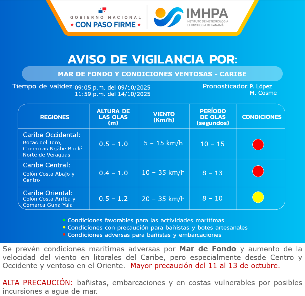 Por mandato de lo establecido en la Ley No. 209 del 22 de abril de 2021, se pone a disposición de los interesados la información contenida en este sitio, para su utilización por cualquier medio legal, pero su uso deberá citar la fuente: INSTITUTO DE METEOROLOGÍA E HIDROLOGÍA DE PANAMÁ, (IMHPA). El instituto, no se hace responsable de ningún error, omisión, interpretación, pérdidas o daños que resulten de la utilización de la información o material contenidos en este sitio, por parte de usuarios, visitantes o terceras personas y su uso indebido y sin confirmar, estará sujeto a sanciones penales (Artículos 289, 290 y 291 del Código Penal) y/o administrativas. Además, en algunos casos que les sea aplicable, dicha información puede ser actualizada por el IMHPA, para corregir errores o imprecisiones
