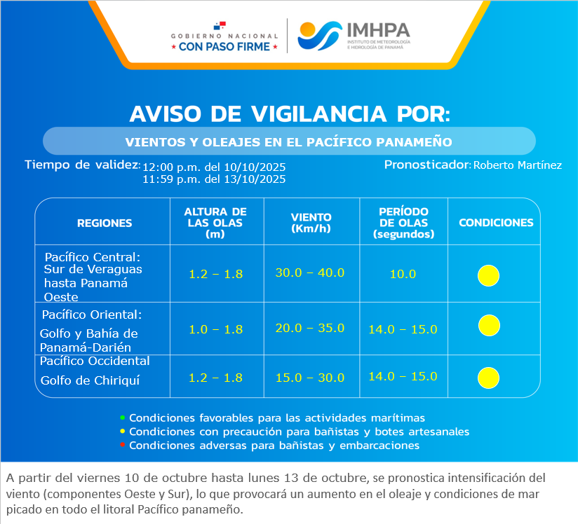 Por mandato de lo establecido en la Ley No. 209 del 22 de abril de 2021, se pone a disposición de los interesados la información contenida en este sitio, para su utilización por cualquier medio legal, pero su uso deberá citar la fuente: INSTITUTO DE METEOROLOGÍA E HIDROLOGÍA DE PANAMÁ, (IMHPA). El instituto, no se hace responsable de ningún error, omisión, interpretación, pérdidas o daños que resulten de la utilización de la información o material contenidos en este sitio, por parte de usuarios, visitantes o terceras personas y su uso indebido y sin confirmar, estará sujeto a sanciones penales (Artículos 289, 290 y 291 del Código Penal) y/o administrativas. Además, en algunos casos que les sea aplicable, dicha información puede ser actualizada por el IMHPA, para corregir errores o imprecisiones