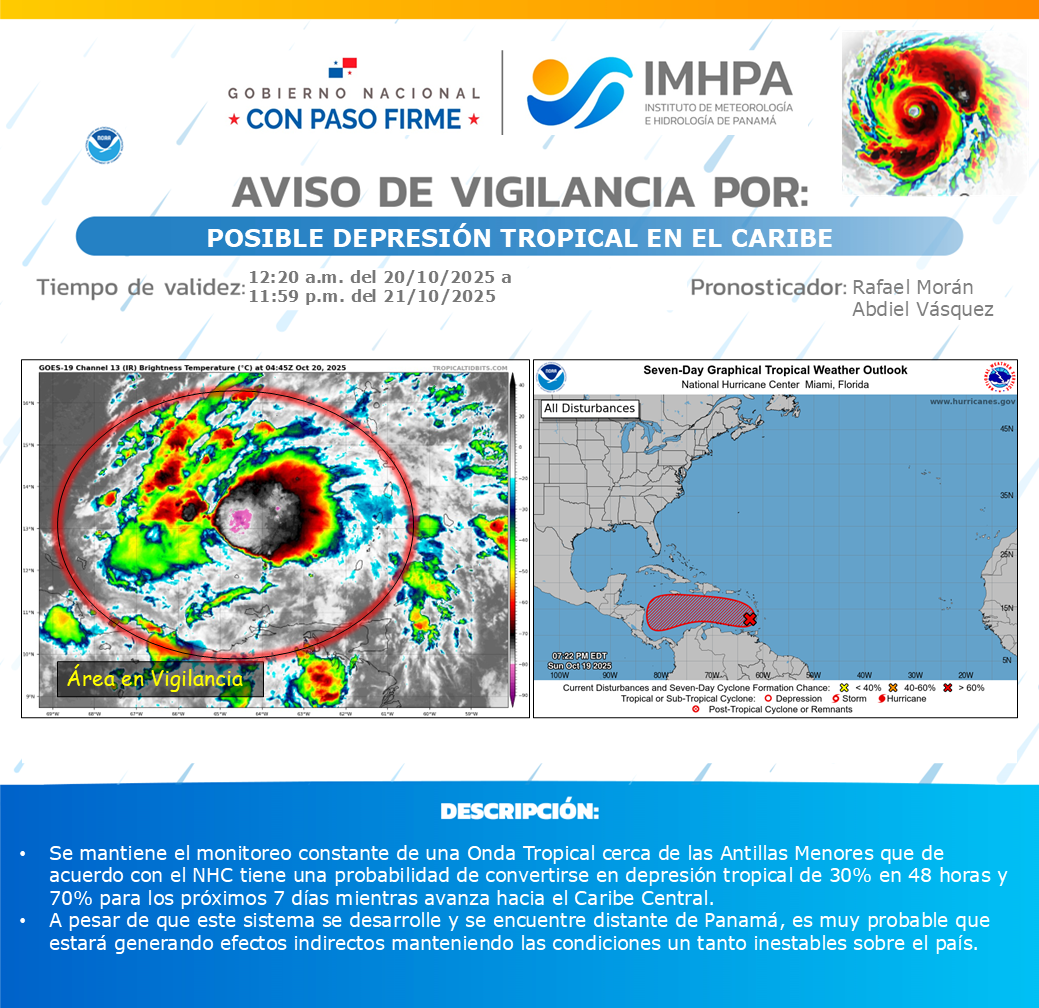 Por mandato de lo establecido en la Ley No. 209 del 22 de abril de 2021, se pone a disposición de los interesados la información contenida en este sitio, para su utilización por cualquier medio legal, pero su uso deberá citar la fuente: INSTITUTO DE METEOROLOGÍA E HIDROLOGÍA DE PANAMÁ, (IMHPA). El instituto, no se hace responsable de ningún error, omisión, interpretación, pérdidas o daños que resulten de la utilización de la información o material contenidos en este sitio, por parte de usuarios, visitantes o terceras personas y su uso indebido y sin confirmar, estará sujeto a sanciones penales (Artículos 289, 290 y 291 del Código Penal) y/o administrativas. Además, en algunos casos que les sea aplicable, dicha información puede ser actualizada por el IMHPA, para corregir errores o imprecisiones