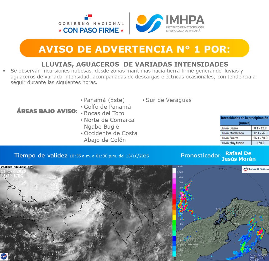Por mandato de lo establecido en la Ley No. 209 del 22 de abril de 2021, se pone a disposición de los interesados la información contenida en este sitio, para su utilización por cualquier medio legal, pero su uso deberá citar la fuente: INSTITUTO DE METEOROLOGÍA E HIDROLOGÍA DE PANAMÁ, (IMHPA). El instituto, no se hace responsable de ningún error, omisión, interpretación, pérdidas o daños que resulten de la utilización de la información o material contenidos en este sitio, por parte de usuarios, visitantes o terceras personas y su uso indebido y sin confirmar, estará sujeto a sanciones penales (Artículos 289, 290 y 291 del Código Penal) y/o administrativas. Además, en algunos casos que les sea aplicable, dicha información puede ser actualizada por el IMHPA, para corregir errores o imprecisiones