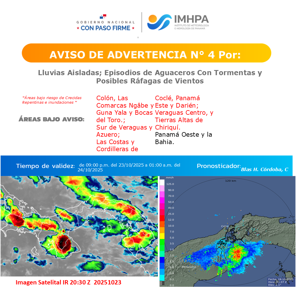 Por mandato de lo establecido en la Ley No. 209 del 22 de abril de 2021, se pone a disposición de los interesados la información contenida en este sitio, para su utilización por cualquier medio legal, pero su uso deberá citar la fuente: INSTITUTO DE METEOROLOGÍA E HIDROLOGÍA DE PANAMÁ, (IMHPA). El instituto, no se hace responsable de ningún error, omisión, interpretación, pérdidas o daños que resulten de la utilización de la información o material contenidos en este sitio, por parte de usuarios, visitantes o terceras personas y su uso indebido y sin confirmar, estará sujeto a sanciones penales (Artículos 289, 290 y 291 del Código Penal) y/o administrativas. Además, en algunos casos que les sea aplicable, dicha información puede ser actualizada por el IMHPA, para corregir errores o imprecisiones