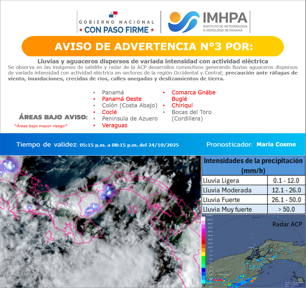 Por mandato de lo establecido en la Ley No. 209 del 22 de abril de 2021, se pone a disposición de los interesados la información contenida en este sitio, para su utilización por cualquier medio legal, pero su uso deberá citar la fuente: INSTITUTO DE METEOROLOGÍA E HIDROLOGÍA DE PANAMÁ, (IMHPA). El instituto, no se hace responsable de ningún error, omisión, interpretación, pérdidas o daños que resulten de la utilización de la información o material contenidos en este sitio, por parte de usuarios, visitantes o terceras personas y su uso indebido y sin confirmar, estará sujeto a sanciones penales (Artículos 289, 290 y 291 del Código Penal) y/o administrativas. Además, en algunos casos que les sea aplicable, dicha información puede ser actualizada por el IMHPA, para corregir errores o imprecisiones