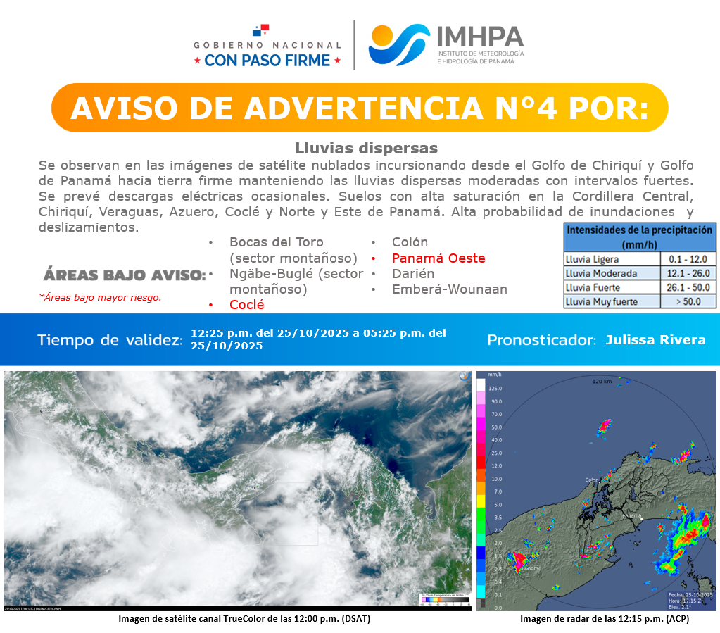Por mandato de lo establecido en la Ley No. 209 del 22 de abril de 2021, se pone a disposición de los interesados la información contenida en este sitio, para su utilización por cualquier medio legal, pero su uso deberá citar la fuente: INSTITUTO DE METEOROLOGÍA E HIDROLOGÍA DE PANAMÁ, (IMHPA). El instituto, no se hace responsable de ningún error, omisión, interpretación, pérdidas o daños que resulten de la utilización de la información o material contenidos en este sitio, por parte de usuarios, visitantes o terceras personas y su uso indebido y sin confirmar, estará sujeto a sanciones penales (Artículos 289, 290 y 291 del Código Penal) y/o administrativas. Además, en algunos casos que les sea aplicable, dicha información puede ser actualizada por el IMHPA, para corregir errores o imprecisiones