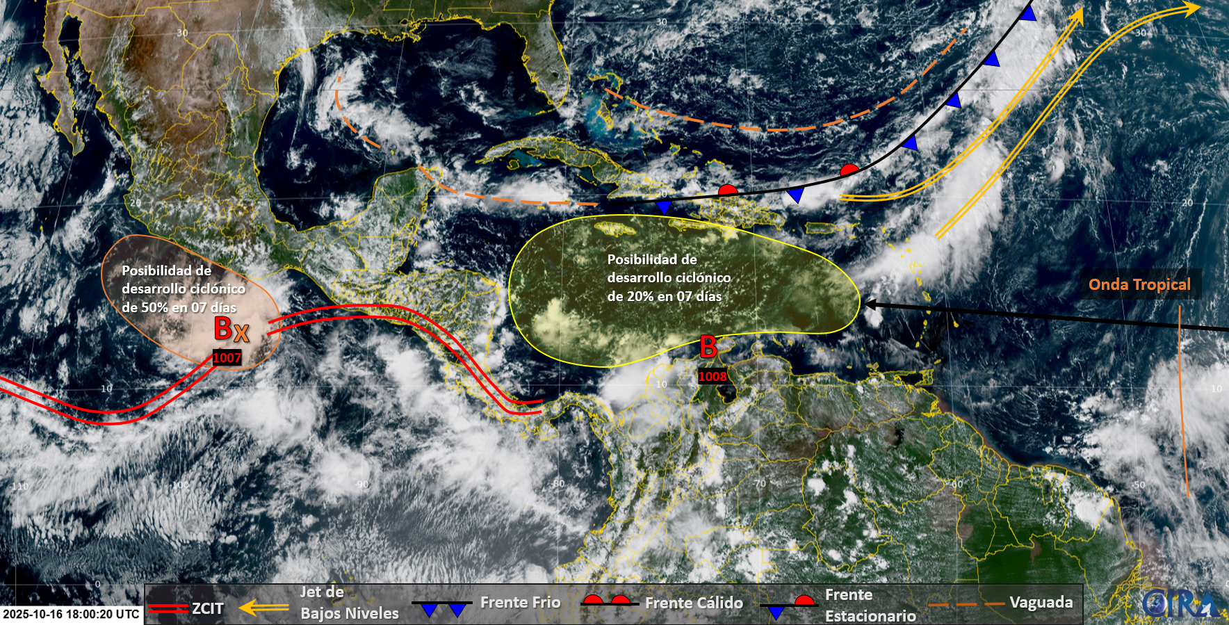 Imagen de satélite con análisis de superficie de las 01:00 p.m. del 16 de octubre de 2025.