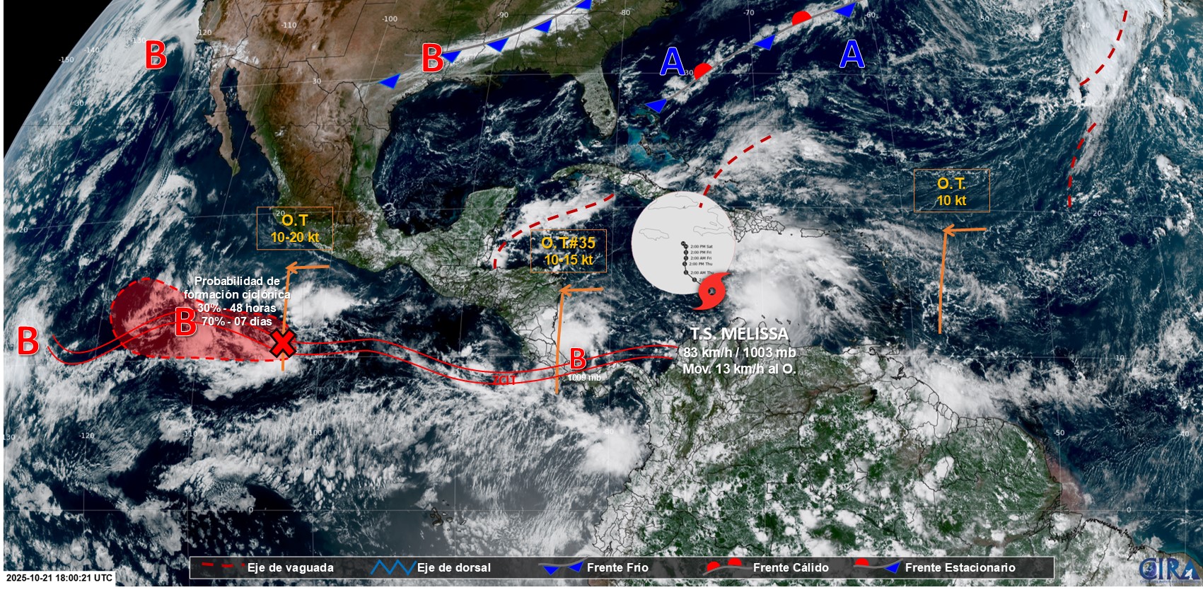 En la carta de superficie se observa la Tormenta Tropical Melissa localizada con una presión atmosférica de 1003 mb y desplazamiento por el momento hacia el oeste a 24 km/h, no obstante, este sistema por el momento cuenta con una alta incertidumbre tanto en trayectoria como en su intensidad. *Por lo que se mantiene en constante monitorio y análisis para determinar las regiones del país con posibles impactos.
